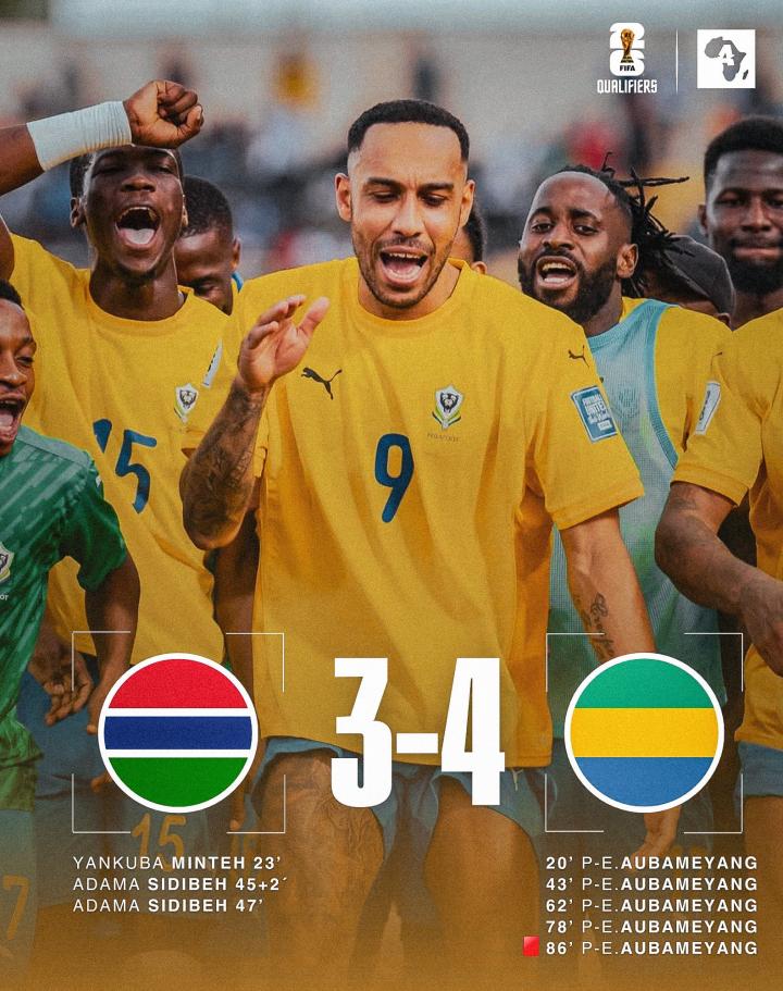 第42分钟,加蓬的门将姆巴巴也不甘示弱,来了一脚精准的长传,奥巴梅扬接球后,跟玩儿似的就单刀破门,还来了个双响炮,加蓬2-1领先冈比亚啦!