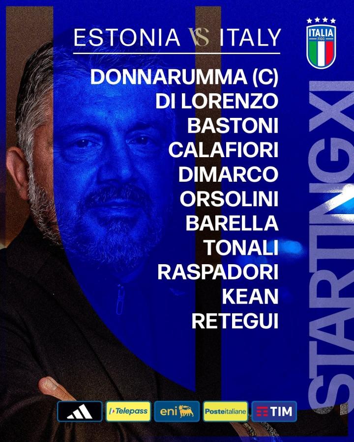 意大利首发阵容:1-多纳鲁马(门将)、22-迪洛伦佐(后卫)、13-卡拉菲奥里(后卫)、21-巴斯托尼(后卫)、3-迪马尔科(后卫)、8-托纳利(中场)、18-巴雷拉(中场)、7-奥尔索利尼(中场)、10-拉斯帕多里(前锋)、9-雷特吉(前锋)、11-莫伊塞-基恩(前锋)